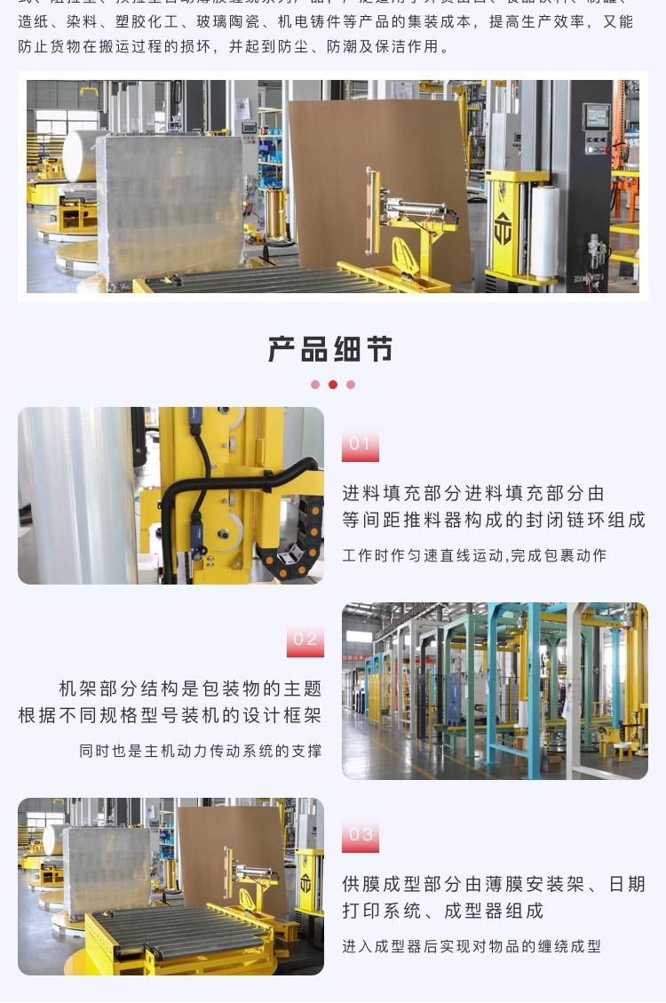 介紹:為適應貨物集裝化儲存、運輸及機械化裝卸作業的包裝要求,設計制造了托盤式、圧頂式、阻拉型、預拉型自動薄膜纏繞系列產品,廣泛適用于外貿出口、食品飲料、制罐、造紙、染料、塑膠化工、玻璃陶瓷、機電鑄件等產品的集裝成本,提高生產效率,又能防止貨物在搬運過程的損壞,并起到防塵、防潮及保潔作用。 適用于快速運輸或儲存; 適應性強,低耗,減輕勞動強度; 對包裝物能起到防塵、防潮、保潔的作用; 減少包裝物的表面擦傷,提高表面質量,使包裝更牢固.