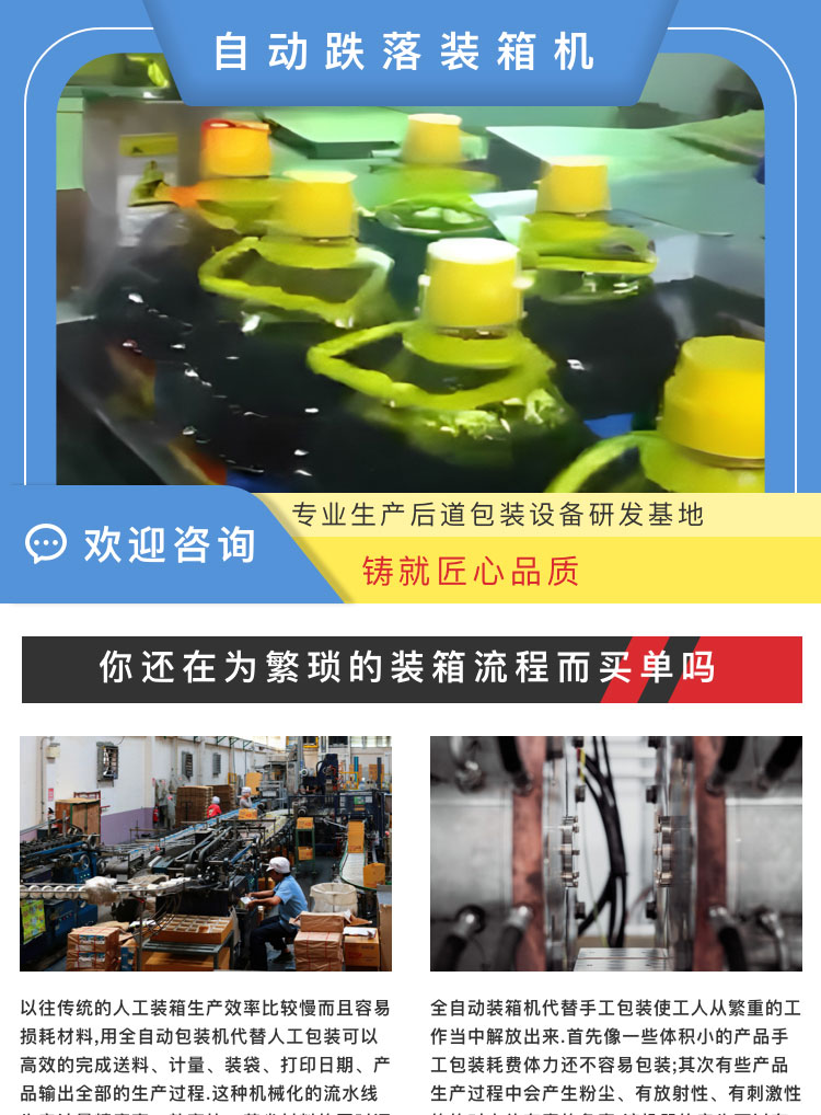 介紹:自動(dòng)跌落裝箱機(jī)。專業(yè)生產(chǎn)后道包裝設(shè)備研發(fā)基地鑄就匠心品質(zhì)。你還在為繁瑣的裝箱流程而買單嗎?以往傳統(tǒng)的人工裝箱生產(chǎn)效率比較慢而且容易損耗材料,用全自動(dòng)包裝機(jī)代替人工包裝可以的完成送料、計(jì)量、裝袋、打印日期、產(chǎn)品輸出全部的生產(chǎn)過程。這種機(jī)械化的流水線生產(chǎn)計(jì)量精度高、效率快、節(jié)省材料的同時(shí)還減少了人工成本。 全自動(dòng)裝箱機(jī)代替手工包裝使工人從繁重的工作當(dāng)中解放出來。像一些體積小的產(chǎn)品手工包裝耗費(fèi)體力還不容易包裝;其次有些產(chǎn)品生產(chǎn)過程中會(huì)產(chǎn)生粉塵、有放射性、有刺激性的的對(duì)人體有毒的危害。該機(jī)器的產(chǎn)生可以的解決這些問題。 產(chǎn)品別稱:裝箱機(jī)、裝盒機(jī)、自動(dòng)裝箱機(jī)、自動(dòng)裝盒機(jī)、跌落式裝箱機(jī)、側(cè)推式裝箱機(jī)、抓舉式裝箱機(jī)、機(jī)器人裝箱機(jī)、一片式裹包機(jī)、食用油跌落式裝箱機(jī)。