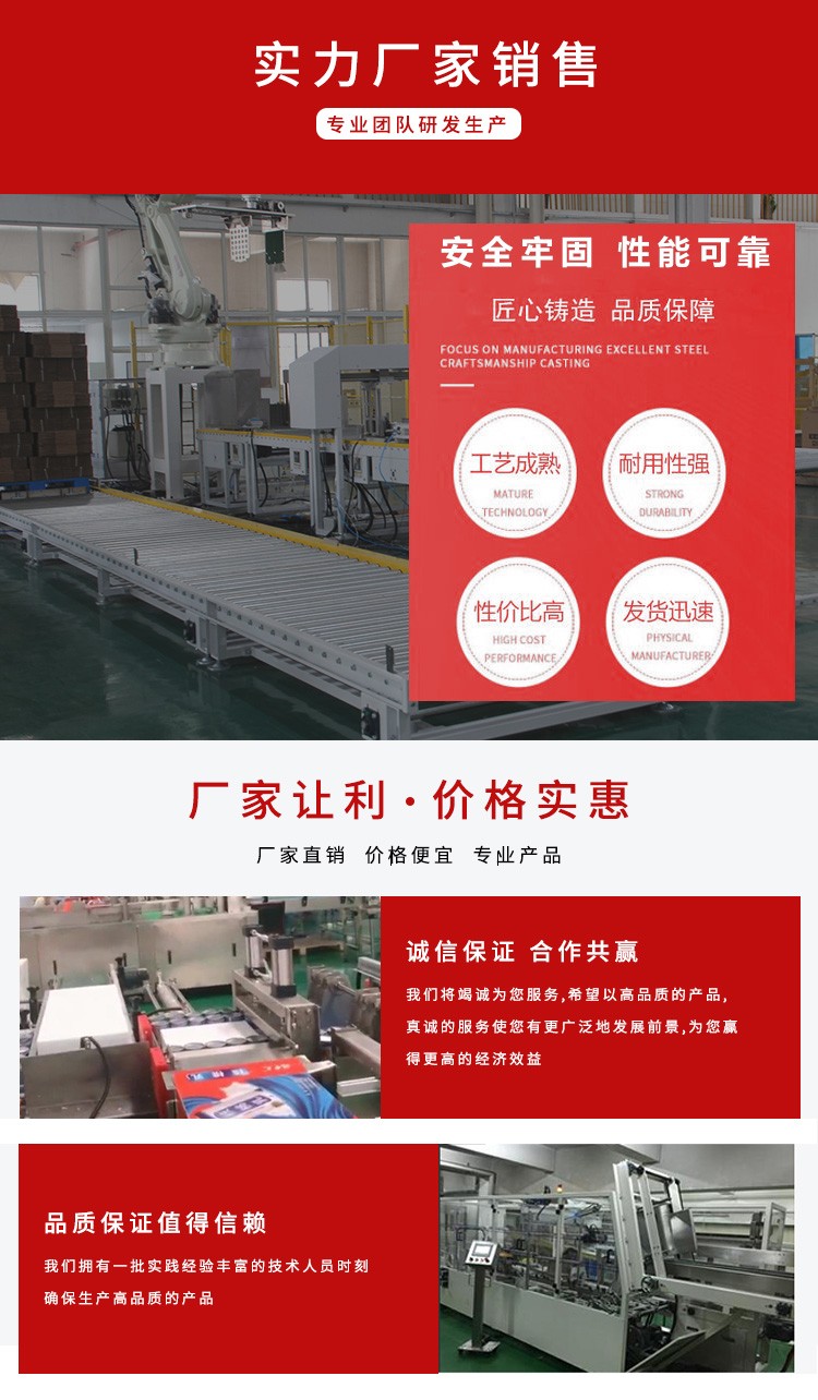 介紹:大型機(jī)械手碼垛機(jī)是一種高度智能化的包裝設(shè)備,主要由大型機(jī)械手臂、先進(jìn)的控制系統(tǒng)、傳感器和夾具組成。它具備強(qiáng)大的抓取能力和承載能力,可以自動(dòng)地完成大規(guī)模產(chǎn)品的抓取、碼垛和放置任務(wù)。大型機(jī)械手碼垛機(jī)通常應(yīng)用于高產(chǎn)、大批量生產(chǎn)的生產(chǎn)線,可以顯著提升生產(chǎn)效率,降低人力成本,同時(shí)保證產(chǎn)品的穩(wěn)定性和包裝質(zhì)量的一致性。這種機(jī)器人碼垛機(jī)廣泛應(yīng)用于各行各業(yè),如物流、汽車、電子、建材等領(lǐng)域,為企業(yè)實(shí)現(xiàn)智能化、自動(dòng)化生產(chǎn)提供了有力支持。其先進(jìn)的技術(shù)和靈活性,使其成為現(xiàn)代化生產(chǎn)線不可或缺的重要設(shè)備。